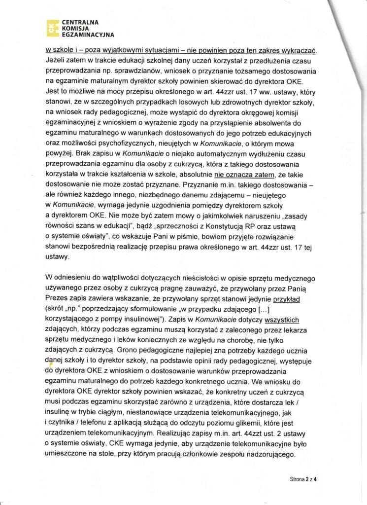 W tym Komunikacie brakuje zapisu o wydłużonym czasie egzaminu dla osób z cukrzycą, który dotychczas był uwzględniony w wytycznych z poprzednich lat. Ponadto w treści komunikatu jest nieprecyzyjny opis, co może wnieść na egzamin osoba z cukrzycą. Może to powodować opór szkół i różne interpretacje powyższych zapisów, czego skutkiem może być niewprowadzenie odpowiednich dostosowań, wynikających z choroby i zaleceń lekarskich osób zdjących egzamin maturalny..