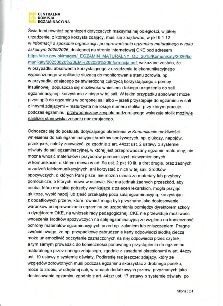2. Z takim zaświadczeniem należy iść do Dyrektora Szkoły i gdyby były jakieś trudności to trzeba go uświadomić, że nawet jeśli w tabelce nie ma przedłużonego czasu pracy dla osób z cukrzycą podczas egzaminów maturalnych, furtką jest powołanie się na 10 punkt komunikatu CKE, który mówi, że dyrektor może sam wystąpić z uzasadnieniem do Okręgowej Komisji Egzaminacyjnej o zgodę na wprowadzenie dostosowań, adekwatnych do potrzeb uczniów.