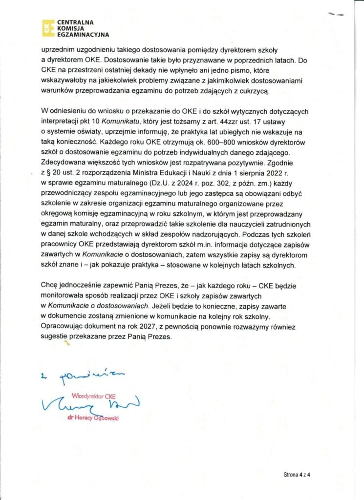 Dziękujemy za umieszczenie w komunikacie odniesień do potrzeb uczniów chorych na cukrzycę w tabeli 1.12 (kategoria: „zdający chorzy lub czasowo niesprawni”). Jednakże, na podstawie wieloletnich doświadczeń oraz sygnałów od rodziców uczniów i środowiska medycznego, wyrażamy stanowczy sprzeciw wobec braku zapisu o możliwości przedłużenia czasu trwania egzaminu dla tej grupy maturzystów, mimo że taka potrzeba wynika bezpośrednio z istoty terapii cukrzycy.