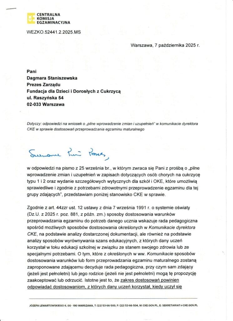 w związku z opublikowanym w dniu 20 sierpnia 2025 roku komunikatem Centralnej Komisji Egzaminacyjnej dotyczącym sposobów dostosowania warunków i form przeprowadzania egzaminu maturalnego w roku 2026, Fundacja dla Dzieci i Dorosłych z Cukrzycą zwraca się z prośbą o pilne wprowadzenie zmian i uzupełnień w zapisach dotyczących osób chorych na cukrzycę typu 1 i 2 oraz wydanie szczegółowych wytycznych dla szkół i OKE, które umożliwią sprawiedliwe i zgodne z potrzebami zdrowotnymi przeprowadzenie egzaminu dla tej grupy zdających.